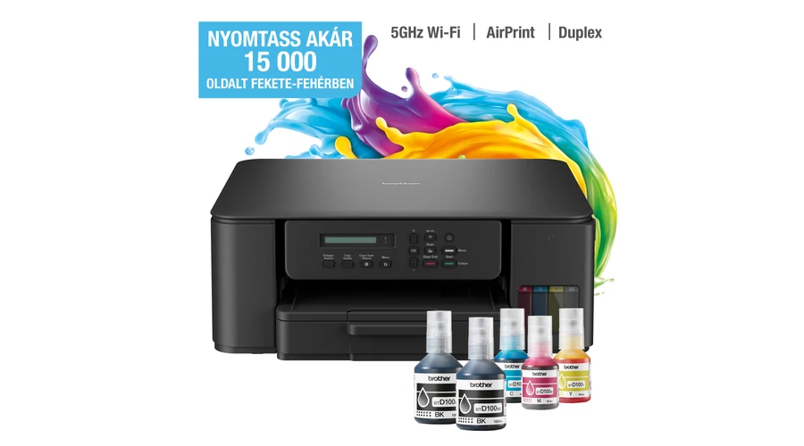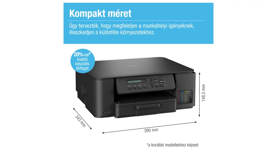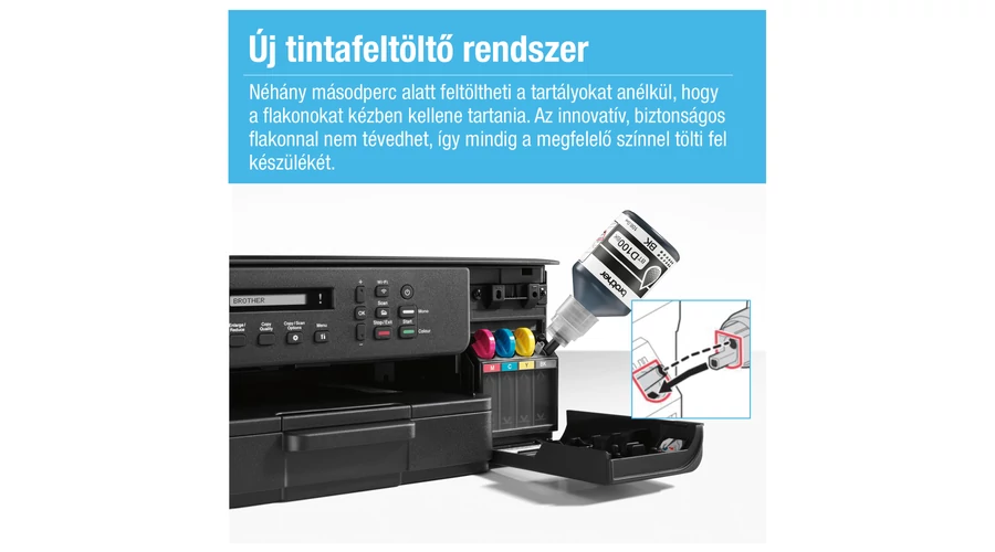 A DCP-T530DW dobozában 2x fekete tintatartály (7500 oldalnyi festék), 1x cián tintatartály (5000 oldalnyi festék), 1x magenta tintatartály (5000 oldalnyi festék) és 1x sárga tintatartály (5000 oldalnyi festék) található.